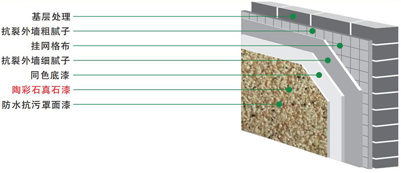 建议配套产品:同色底漆一遍,陶彩石真石漆两遍(建议涂装道数),专用罩光面漆一遍。