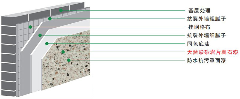 建议配套产品:同色底漆一遍,天然彩砂岩片真石漆两遍(建议涂装道数),专用罩光面漆一遍。